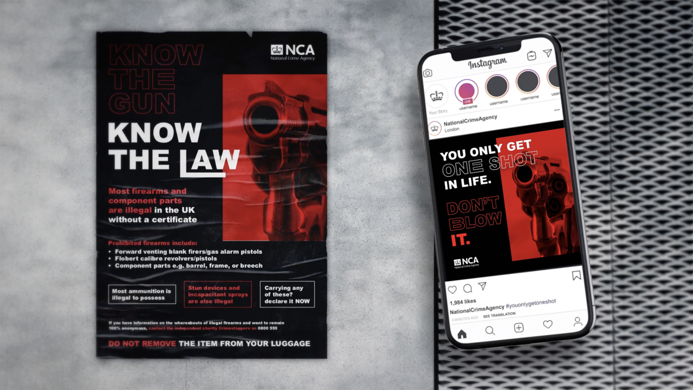 Our creative teams were tasked with concepting, scripting, editing and animating a short film and supporting static assets for a national firearms prevention campaign. The video would be used for no-cost and in paid-for social media, raising awareness about firearm legislation in the UK and encouraging people to stop breaking the law and putting themselves at risk by bringing dangerous weapons into the country.